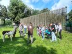 Am Dienstag, 2. August 2023 waren Außerirdische vom Planeten Uranus zu Gast im Jugendzentrum Ost in Ahlen. Außerirdische? Nicht ganz, es waren Emma und Bruno, zwei Alpakas von der Alpakafarm „Finja & Friends“ aus Dolberg. Alpakas sind die Bewohner des Planeten Uranus? Zumindest bei den über 60 Kindern der OGS-Ferienbetreuung, die im Jugendzentrum Ost aktuell stattfindet. Denn da dreht sich alles um Planeten. Das Alpaka, auch Pako, ist eine aus den südamerikanischen Anden stammende, domestizierte Kamelart, die vorwiegend wegen ihrer Wolle gezüchtet wird. Der Bestand an Alpakas in Peru liegt bei etwa 3,5 Millionen Tieren, was ca. 80 Prozent des weltweiten Bestandes ausmacht. „Tiere sind in Bezug auf Kinder immer aufregend“, fand Lisa-Marie Rammler von der Stadt Ahlen, die auf die Idee gekommen war, die beiden Alpakas als Überraschungsgäste einzuladen. Wobei der Begriff Überraschungsgäste zutrifft, die Mädchen und Jungen hatten von dem Besuch keine Ahnung und waren umso mehr begeistert.