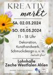 Ebenso laufen die Anmeldungen für den Kreativmarkt auf Hochtouren, der über zwei Tage am Samstag, 02.03. und am Sonntag, 03.03.2024 von 11 bis 18 Uhr in der Lohnhalle stattfinden soll. "Wir haben in Ahlen und in der Region so viele künstlerisch und kunsthandwerklich Interessierte, denen wir gerne eine Ausstellungsbühne geben," freut sich Hermann Huerkamp, Leiter des Stadtteilbüros auf den Markt. "Grundlage ist ein fester Stamm von Anbietern," berichtet Christa Wolf, die von Anfang an die Märkte begleitet und mit einem eigenen Stand immer dabei war, "und einige neue Aussteller präsentieren sich und ihre Produkte ebenfalls gern". So sei sichergestellt, dass es immer wieder neue, innovative und kreative Produkte geben würde und die Besucher was entdecken können. Den gastronomischen Part übernimmt bei beiden Veranstaltungen der ansässige Zechencaterer "cookandchill", der mit seinen belgischen Waffeln und selbstgebackenem Käse- und Mohnkuchen die Gäste verwöhnen will.