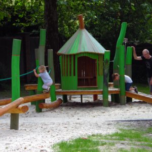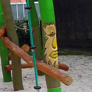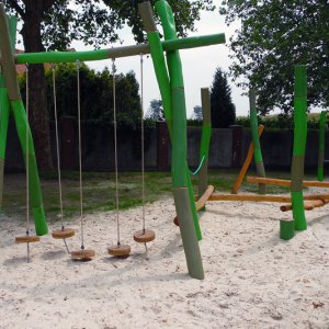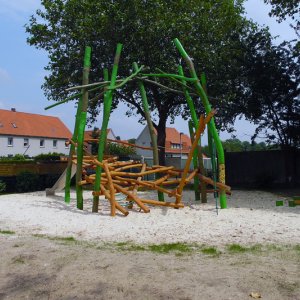 Diese sind dann auch größtenteils verwirklichen worden. Die Spielgeräte sind kindgerecht gestaltet und bestehen aus robustem Robinienholz sowie in Teilen aus Eichenholzelementen. Eichenholz zeichnet sich durch seine kurze Faserstruktur (wenig Splittergefahr) und extreme Festigkeit aus. Der Vorteil ist, dass das Holz nach dem Einbau im Außenbereich mit jedem Jahr immer härter wird. Dadurch erzielt man eine große Wartungsarmut und eine sehr geringe Abnutzungserscheinung. Da hat dann auch noch die nächste Generation Spaß daran.